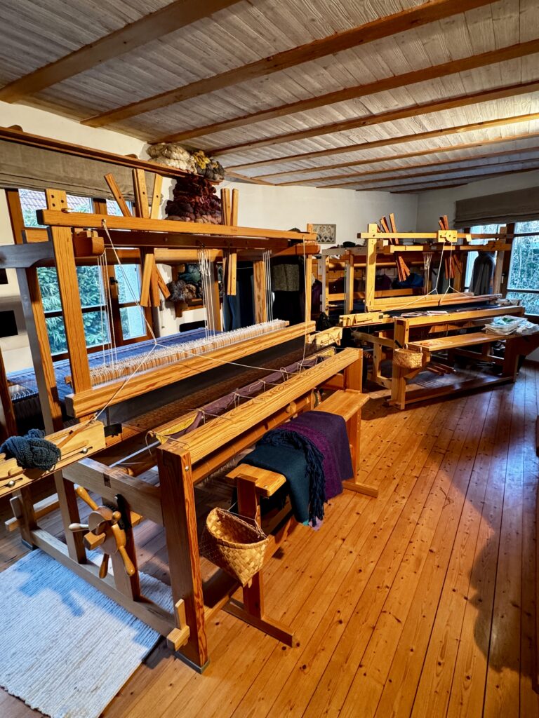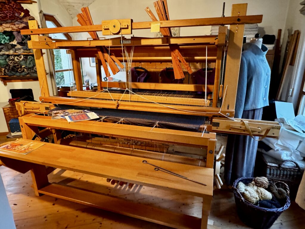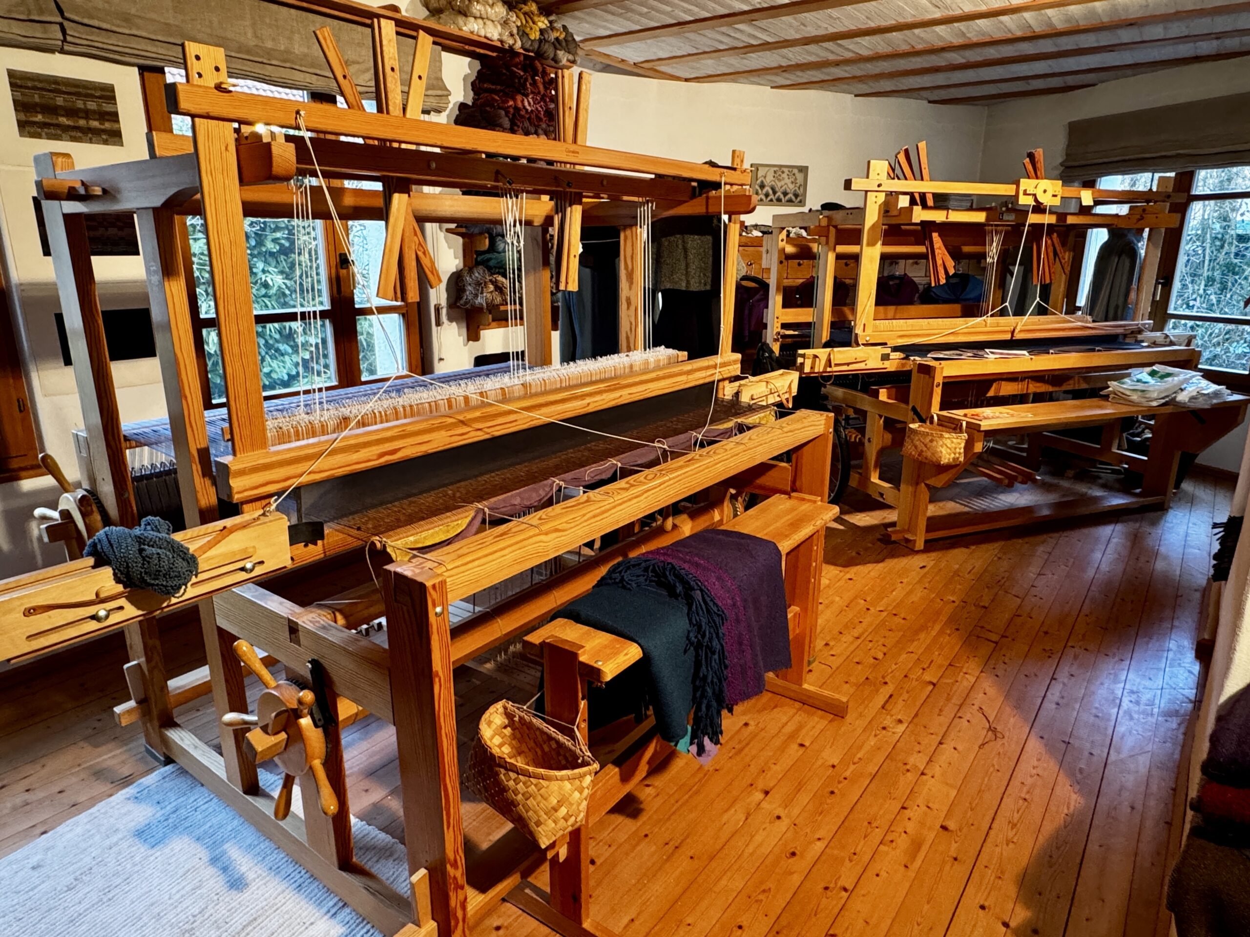 Zum Atelier gehören zwei Webstühle. Sie wurden in den 1980er Jahren gekauft. Ein Webstuhl ist von LERVAD (Dänemark), einer von Glimakra (Schweden). Beide haben eine Webbreite von 160cm und mindestens 12 Schäfte. Unsere Preisvorstellung beträgt 2.000 Euro je Webstuhl. Am besten vor Ort ansehen.